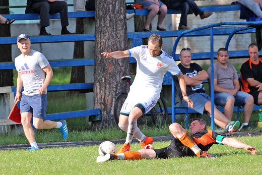 Капитан команды «ПМС» Александр Рабцевич в подкате выбивает мяч у игрока «Строителя – ПМК-14» Олега Бертоша